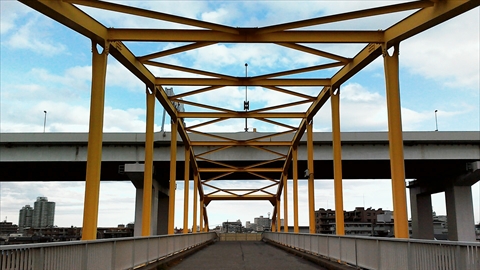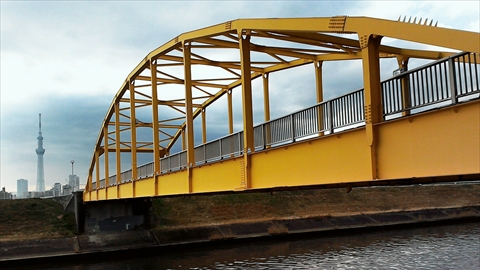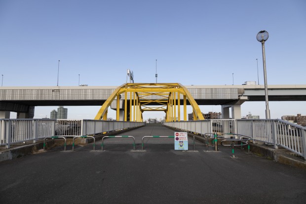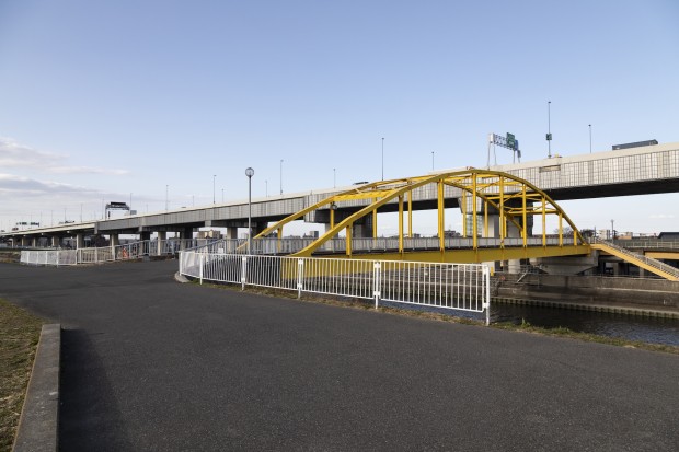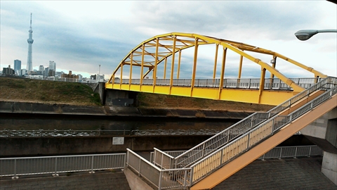 コメント 荒川河川敷への避難橋として綾瀬川に架かる黄色いアーチ橋が東四つ木避難橋です。